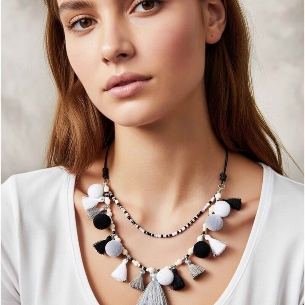 Multilayer boho necklace in neutral black, white & gray with fluffy pom poms and flowing tassels. Timeless elegant contrast, sophisticated texture. Perfect layering or solo 2026 trend.