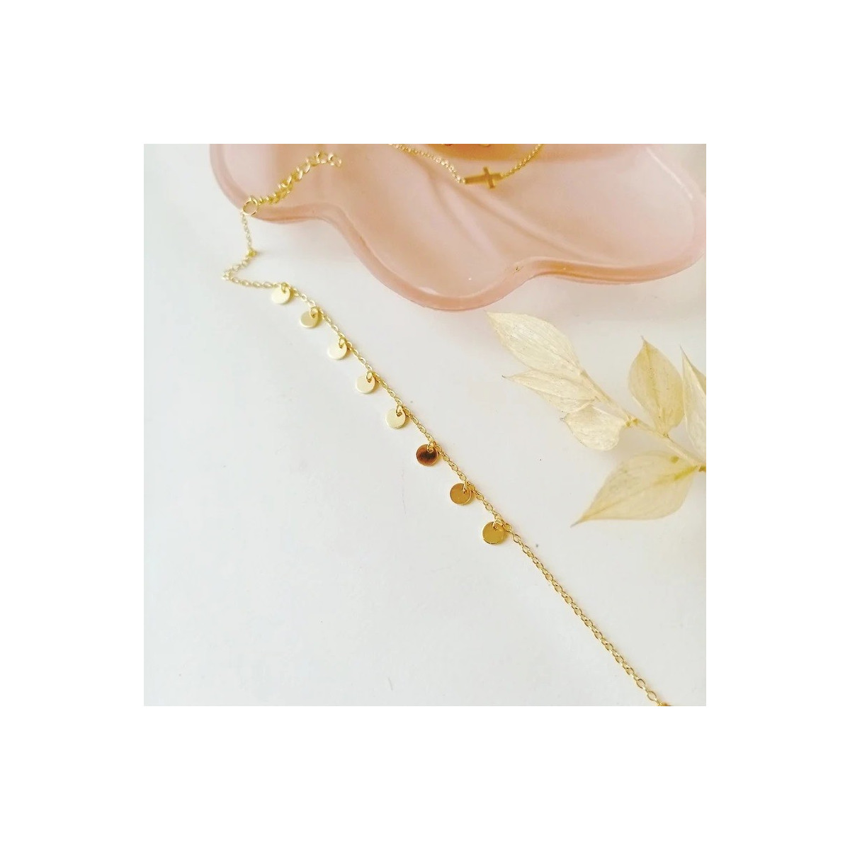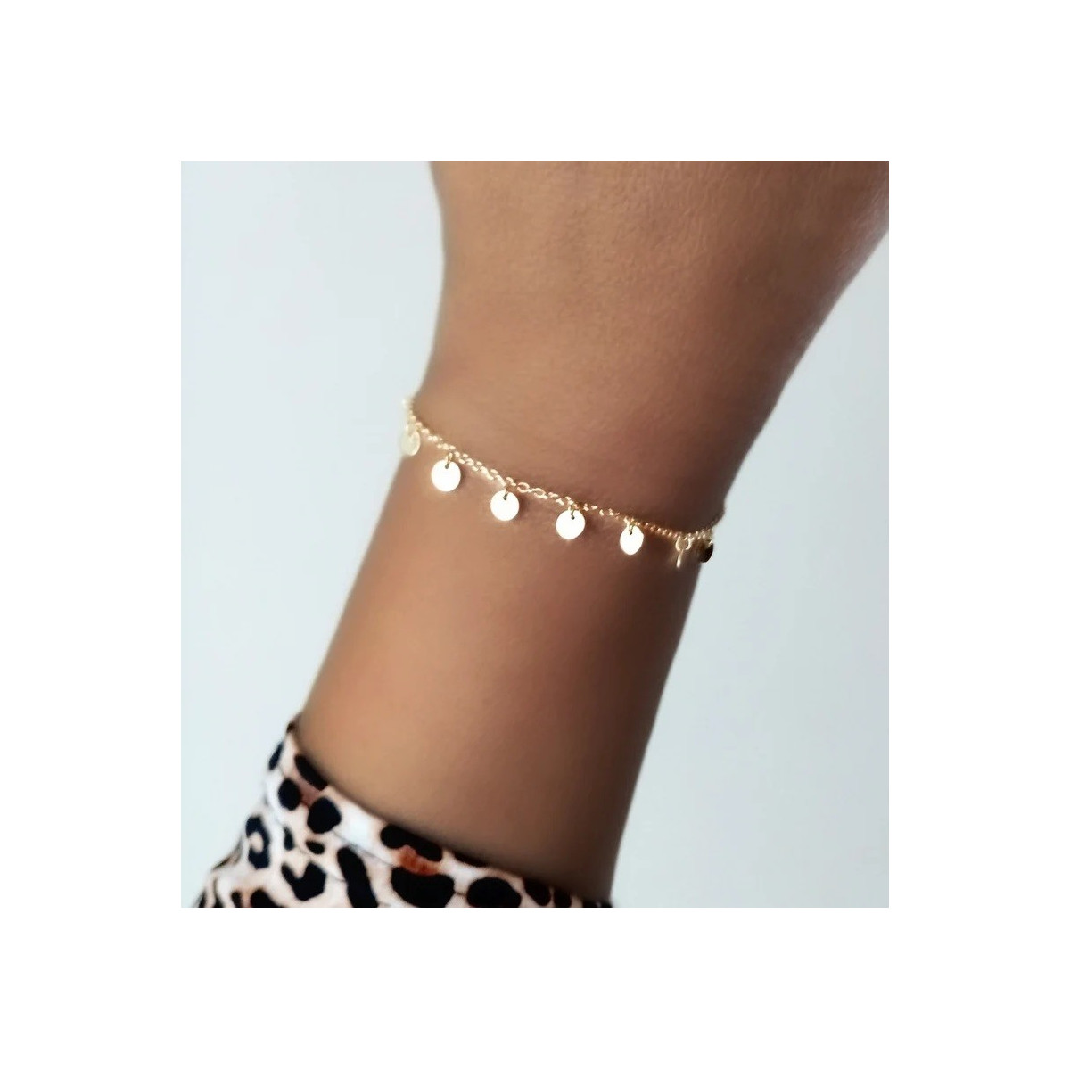 Esta pulsera se compone de una cadenita de plata de la que cuelgan 8 plaquitas de 5 mm de diámetro tambien de plata bañada en oro de 18 kilates. Mide 16 cm de largo y posee una pequeña extensión de otros 3 cm.