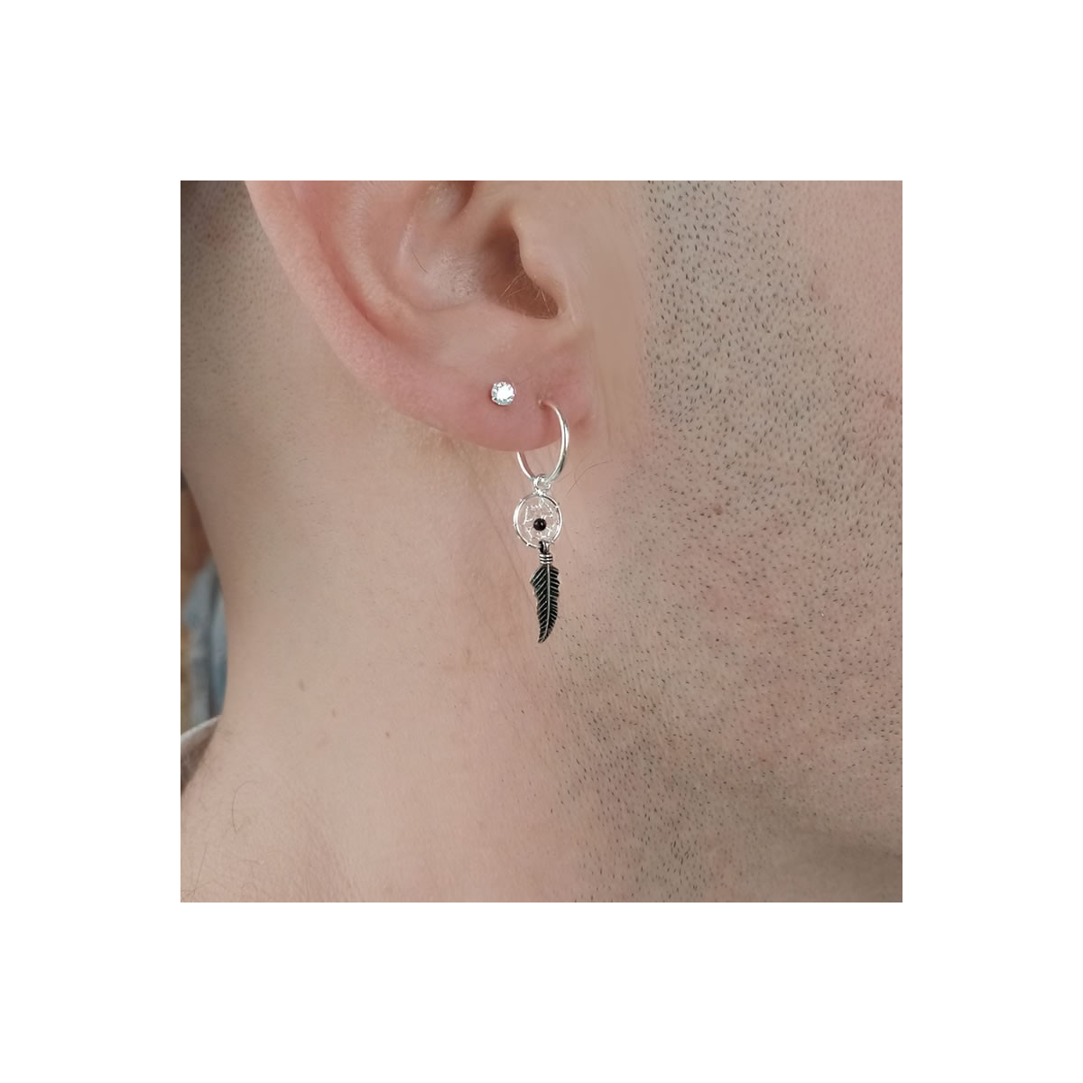 The design includes a small feather hanging from the hoop, adding an ethnic and original touch. The hoops have a diameter of 12 mm, while the dreamcatcher measures 18 mm, creating a piece that stands out for its elegance and symbolism.