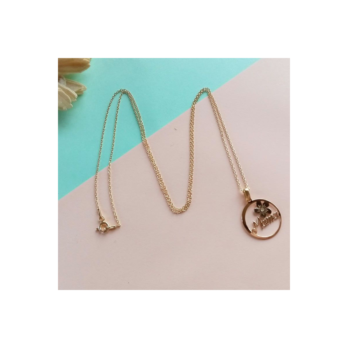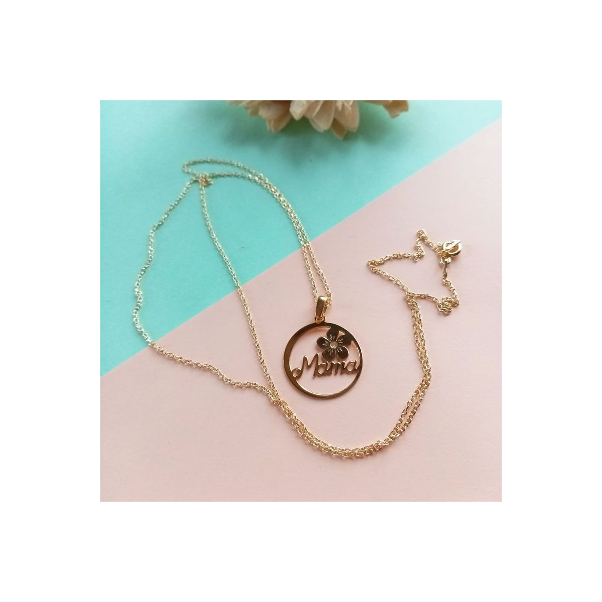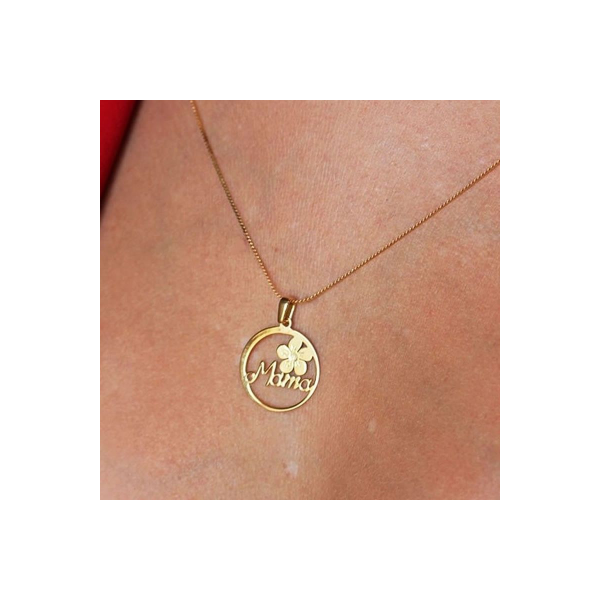 Collar elaborado en Plata con Medallita redonda con la palabra Mama decorada con flores.