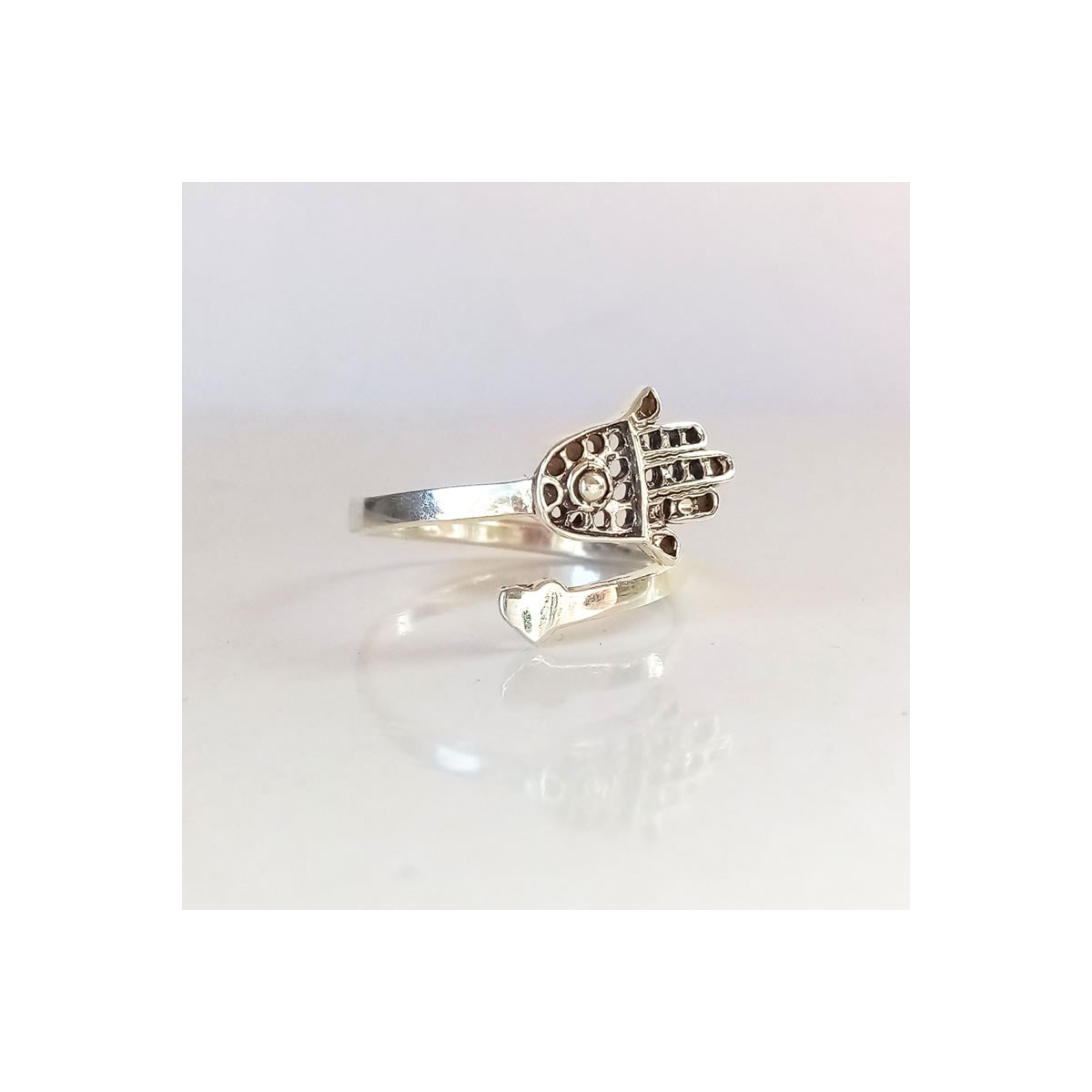 Open and adjustable 925 sterling silver ring featuring a Hamsa Hand and a heart design, symbolizing protection and love