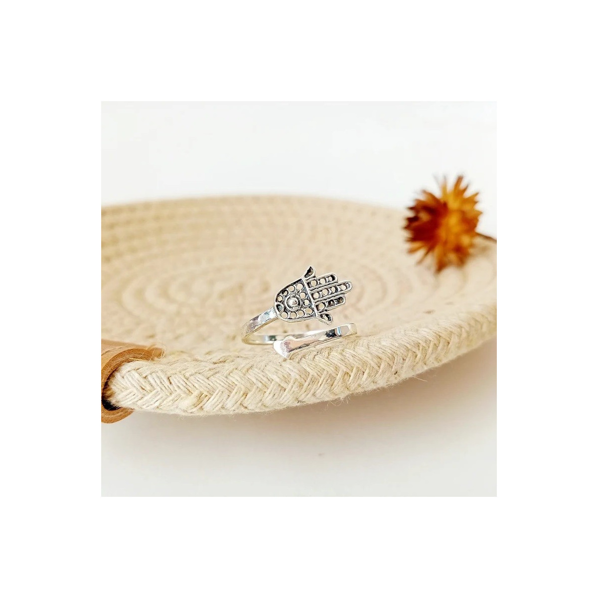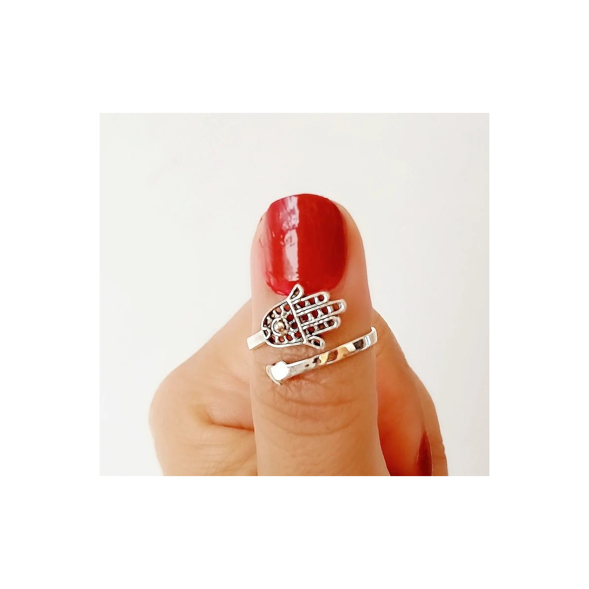 Introducing our Adjustable Hamsa Hand Ring, meticulously crafted from high-quality 925 sterling silver. This open-design ring features the Hamsa Hand on one end and a heart on the other, symbolizing protection and love.