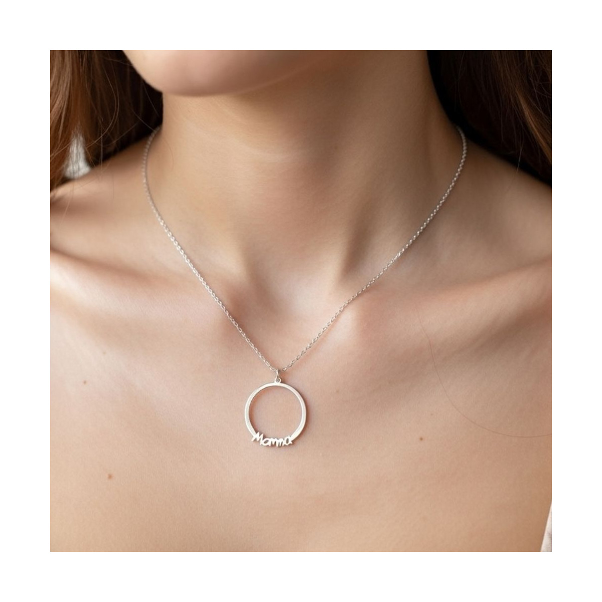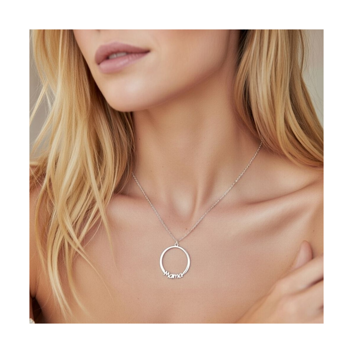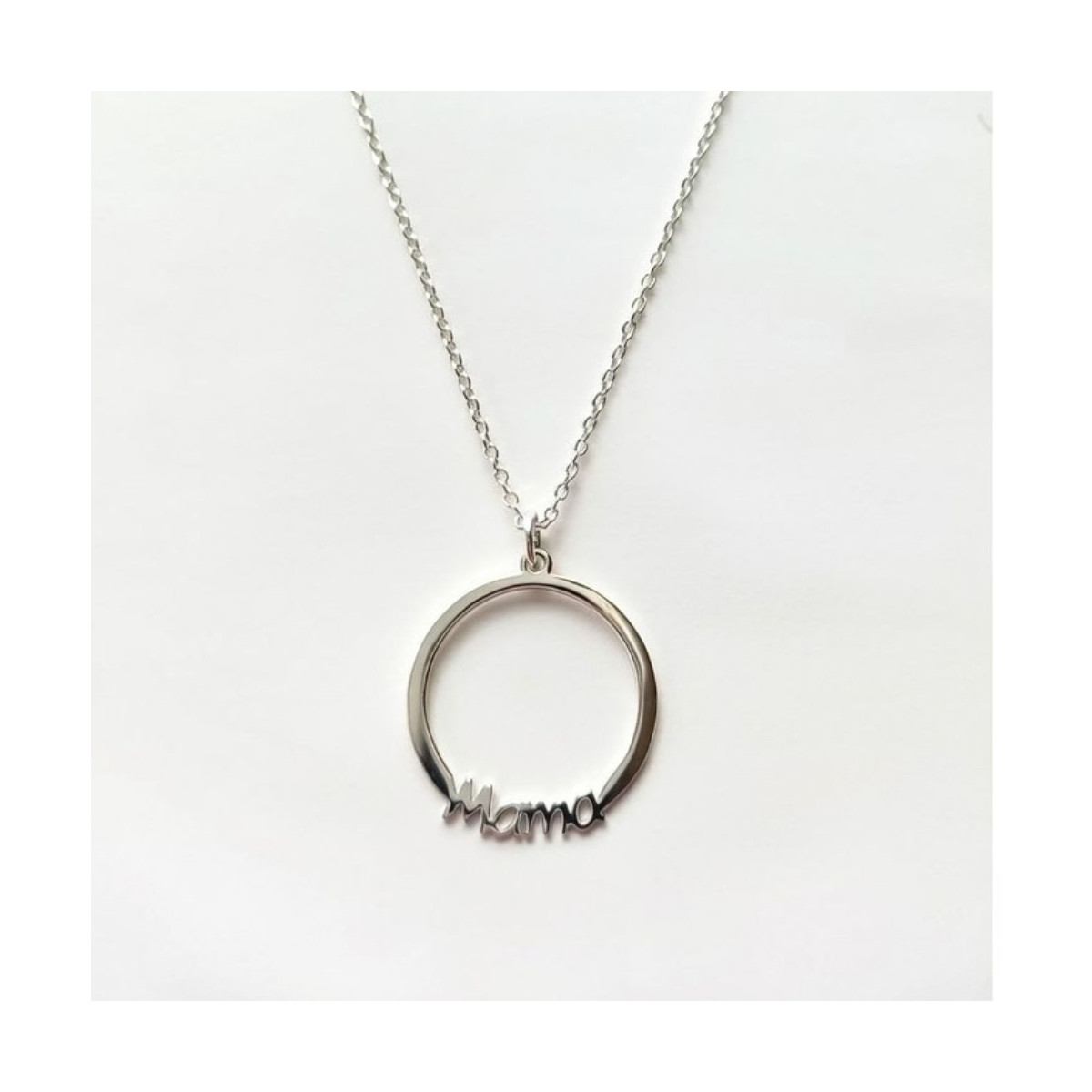 Está compuesto por una fina gargantilla de 40 cm de largo y decorado con un colgante en forma de círculo con la palabra Mama insertada en su interior.