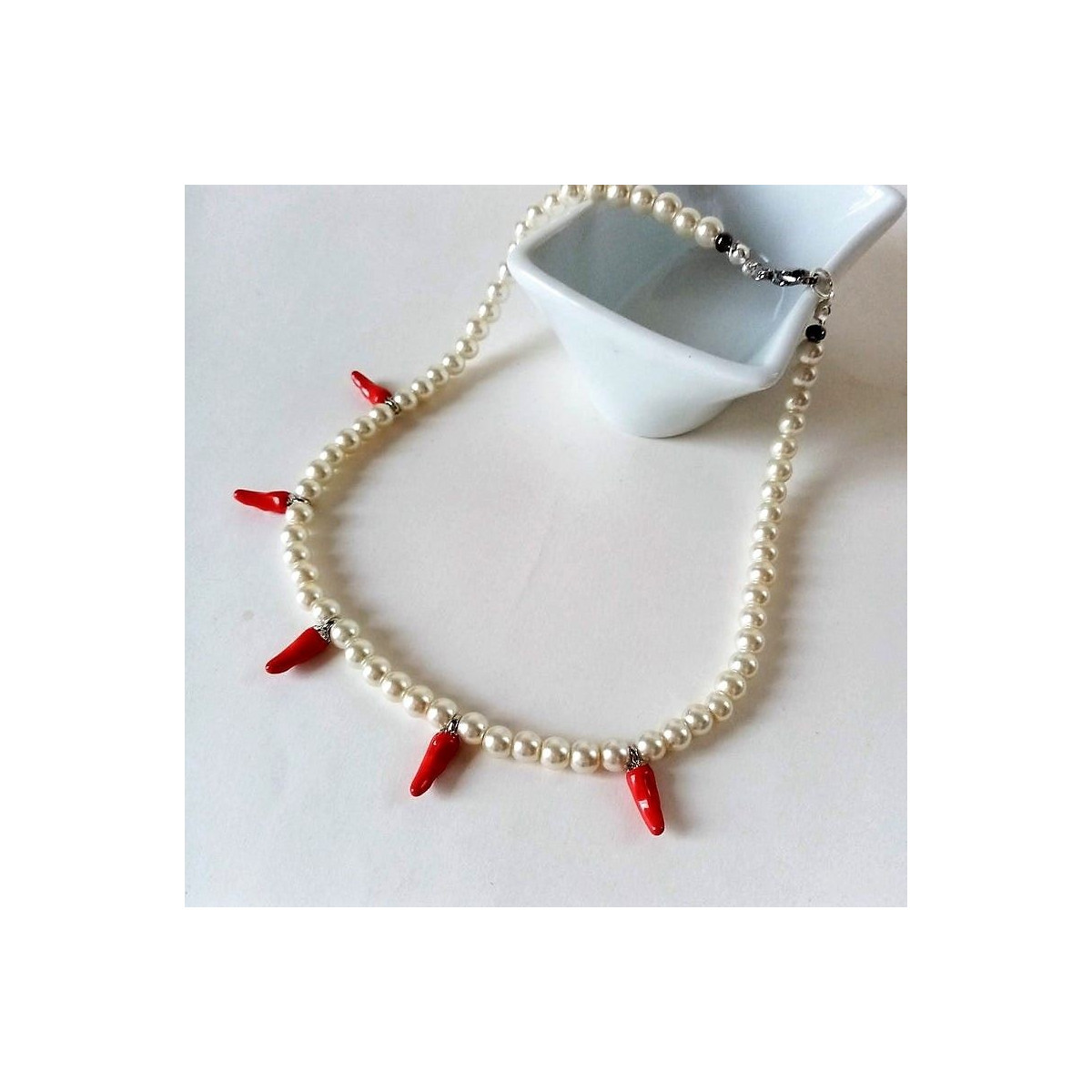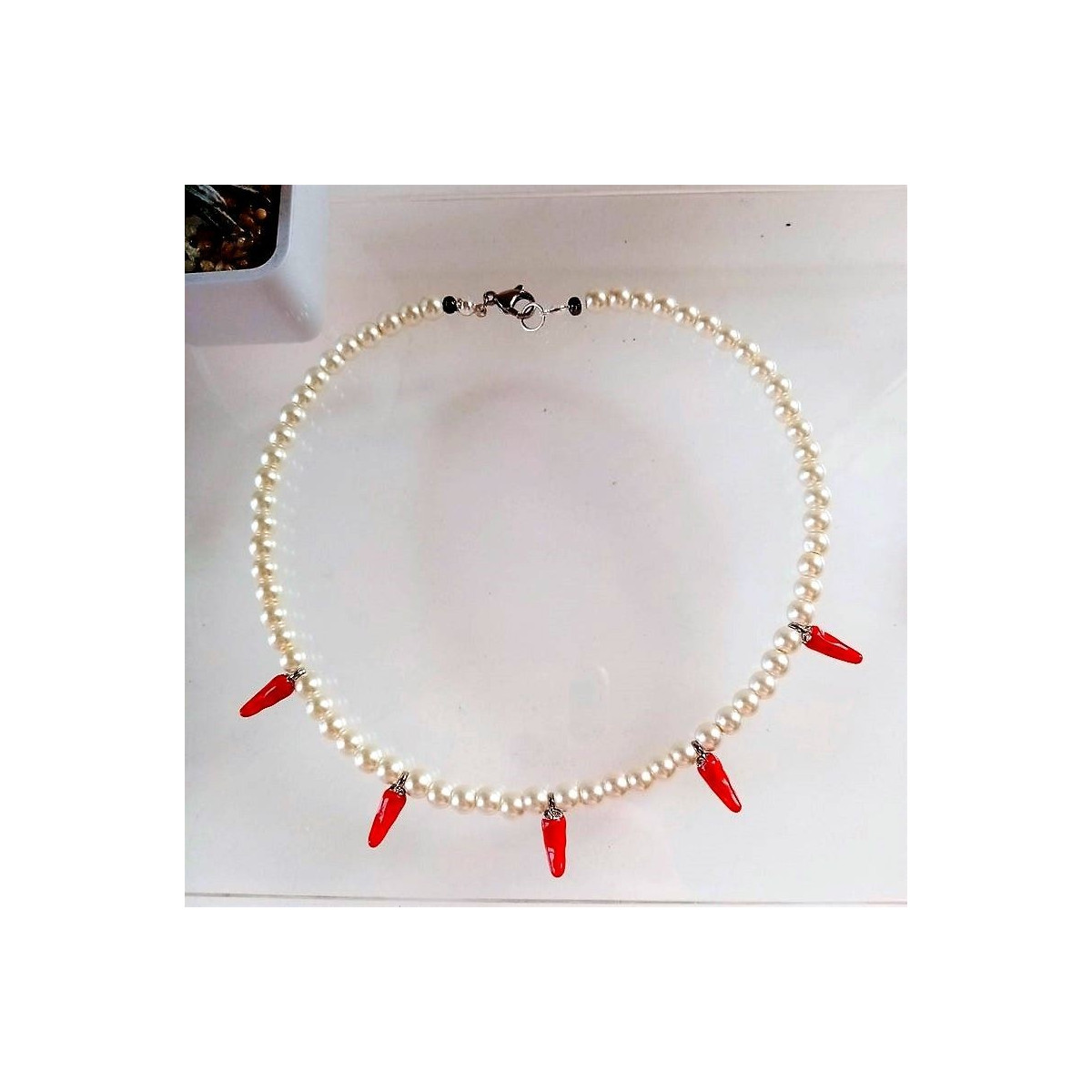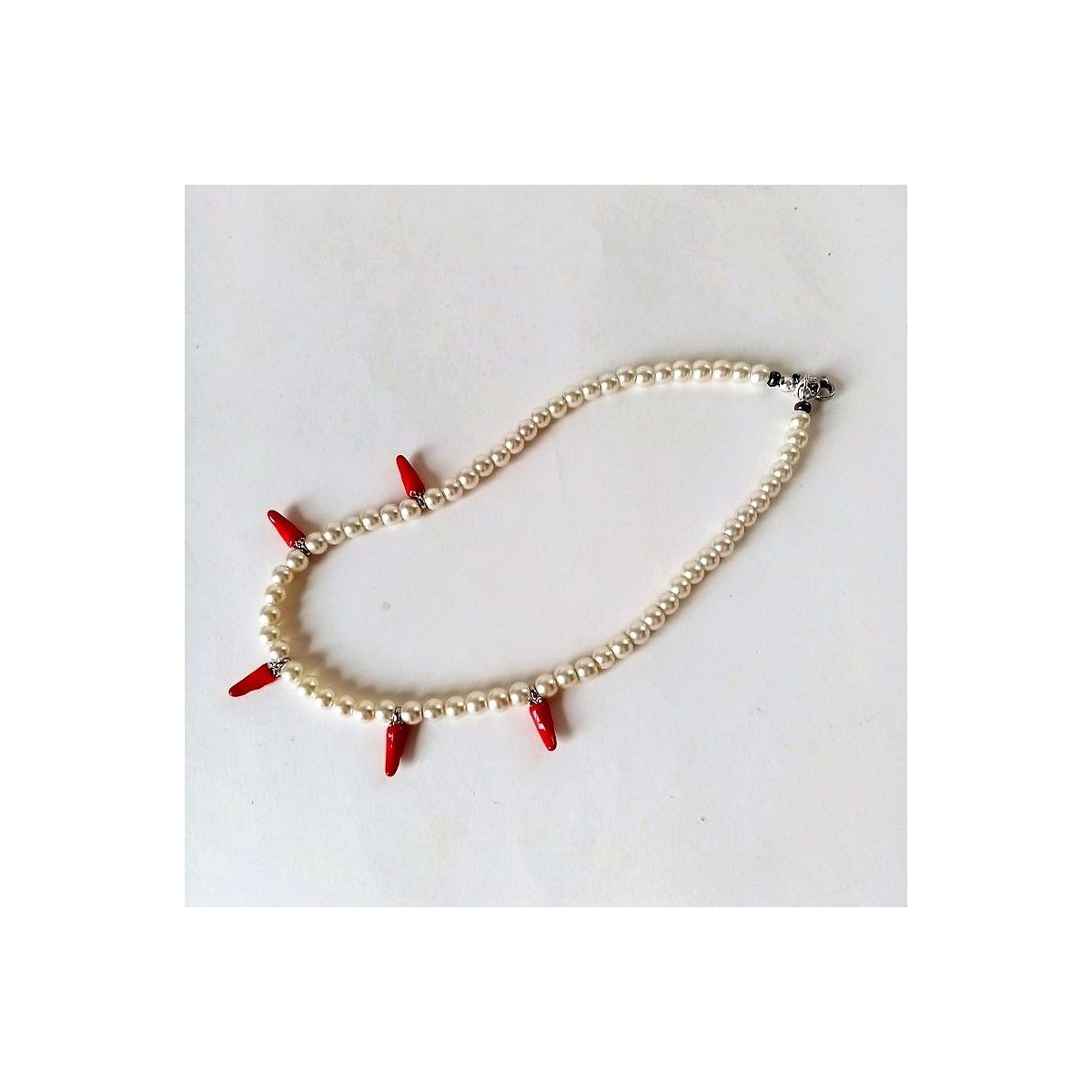 Trendy necklace with fashionable charms: Red chili peppers, made with crystal pearls and stainless steel.