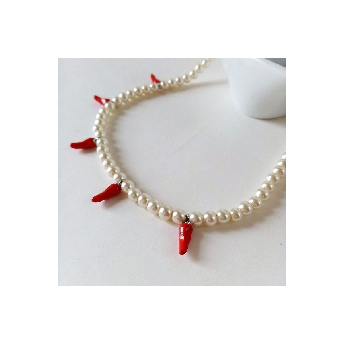 The Silver Chili Necklace is a unique and modern piece that is trending this season. This necklace is crafted with crystal pearls and adorned with red chili pepper charms, adding an original and fun touch.