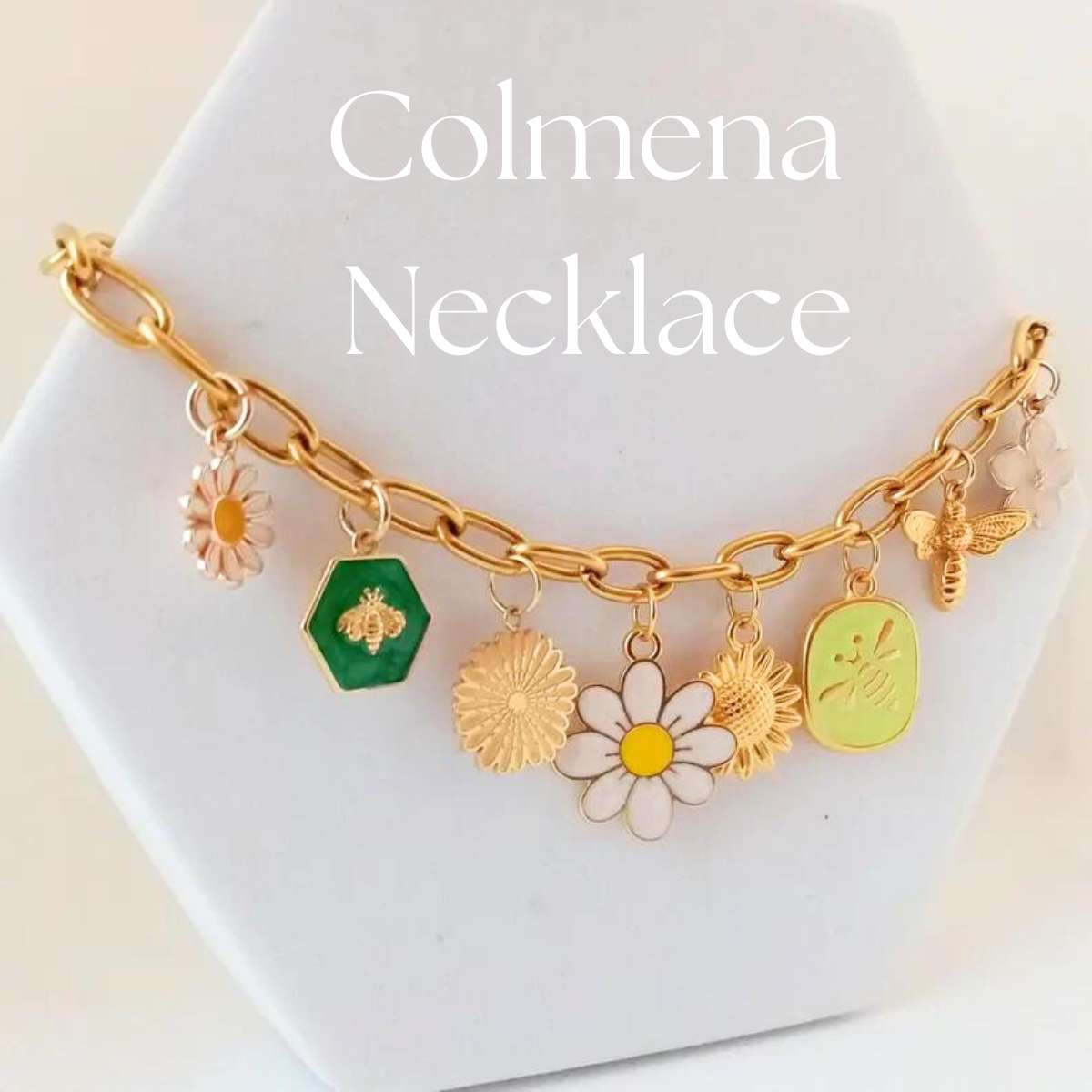 "Colmena" necklace in gold-plated stainless steel, adorned with charming flower, daisy, and bee charms and pendants, perfect for a fresh and natural look.