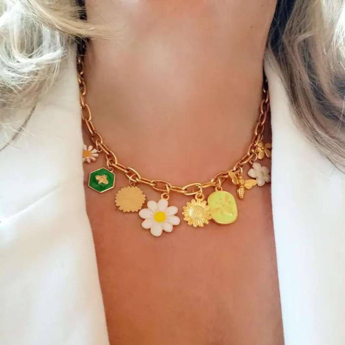 - Charms: Flowers, daisies, and bees crafted with a shiny gold finish and precise details.