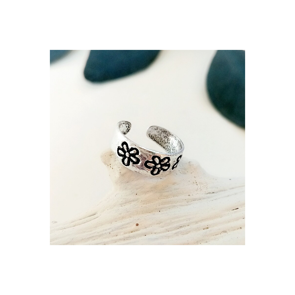 MIDI Flowers Ring: open silver ring with engraved flower design. Perfect for fingers and toes, adding style and elegance. 🌼