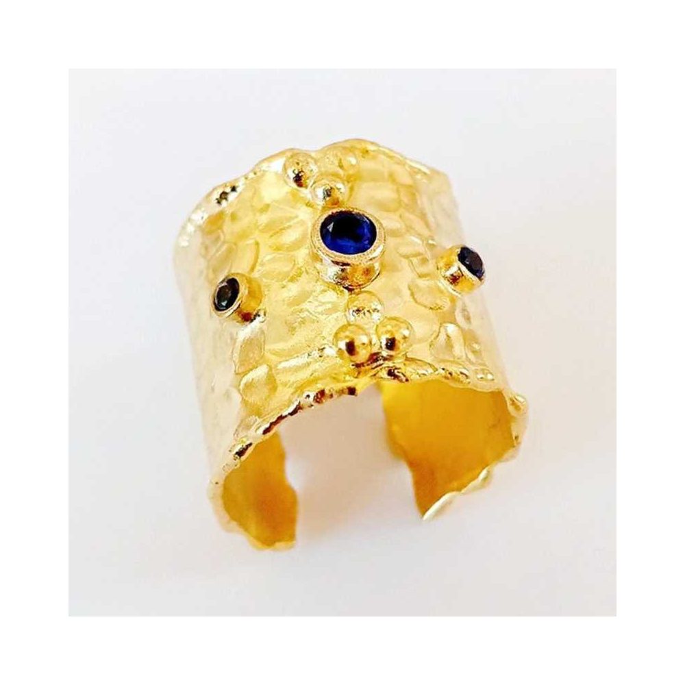 Anillo dorado ancho, abierto y ajustable con piedras swarovsky azules.