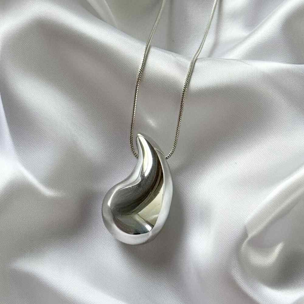 Collar gota plata en acero inoxidable pulido. Diseño fluido y escultural que captura la luz – tendencia sculptural silver 2026. Ligero, hipoalergénico y perfecto para elevar cualquier look diario o especial.