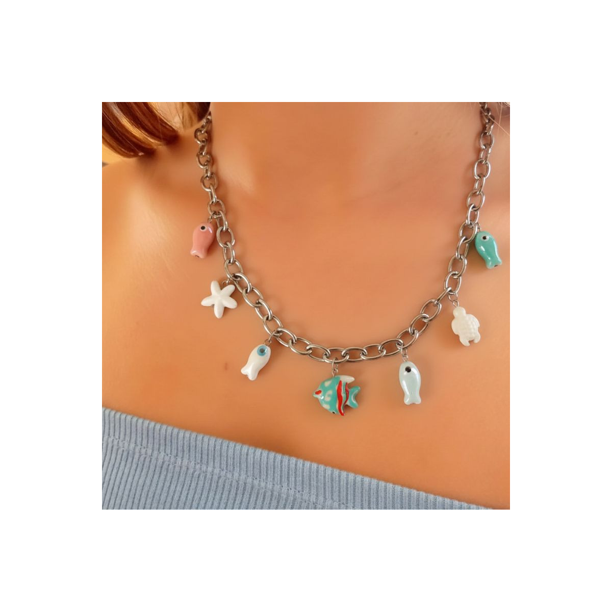 Collar de acero inoxidable con charms marinos de cerámica esmaltada, ideal para añadir un toque fresco y divertido a cualquier look.