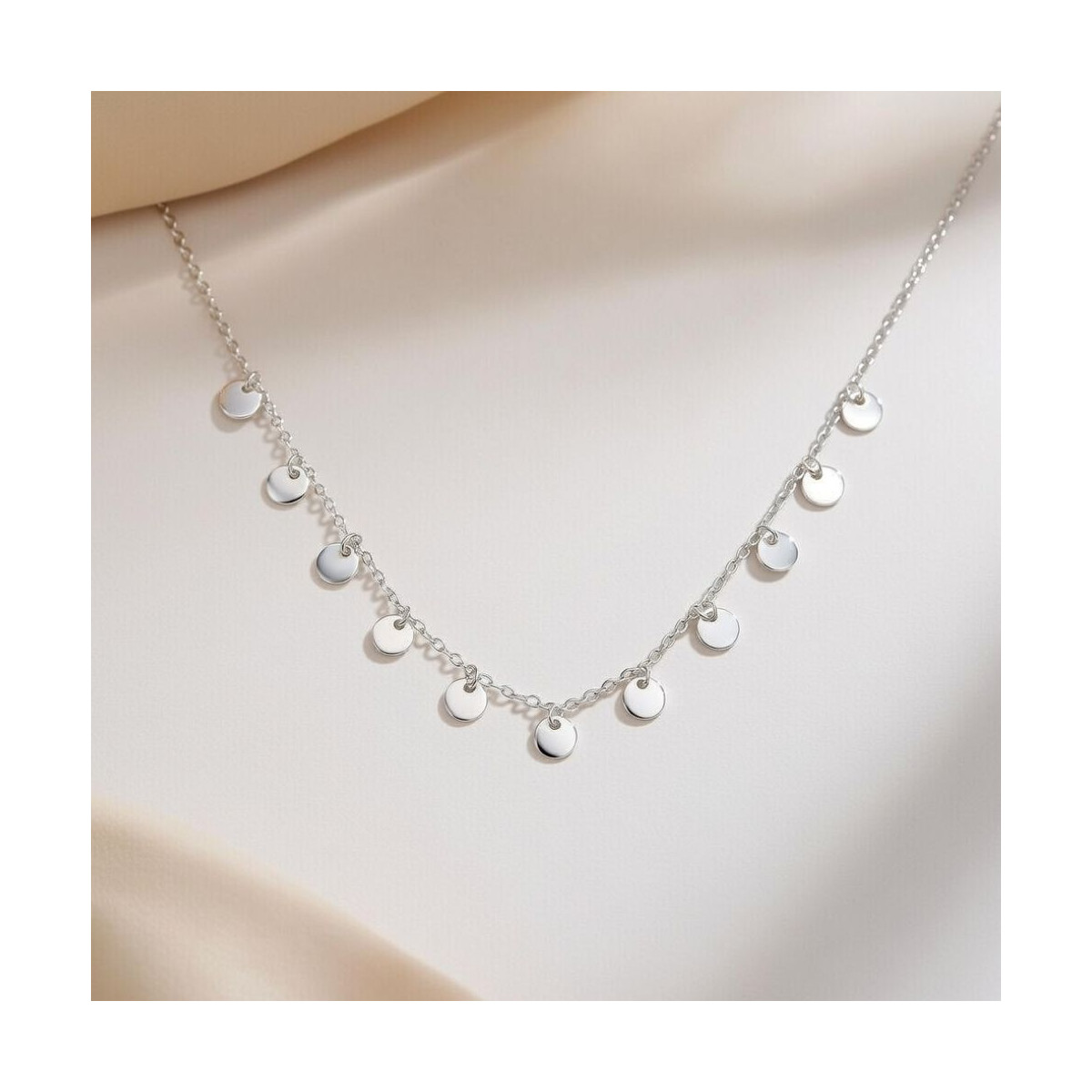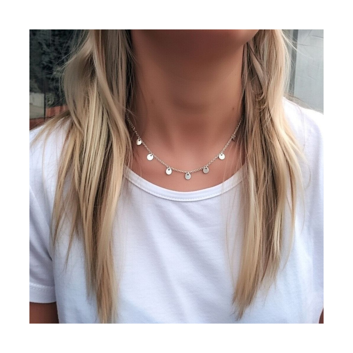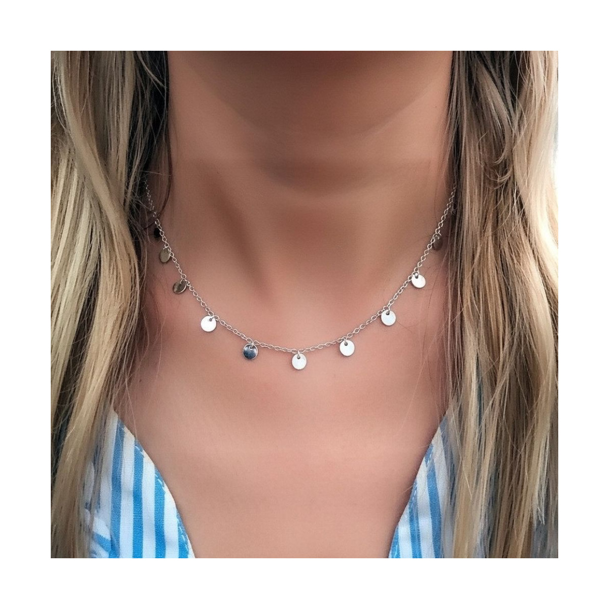 Collar Chicback en plata de ley muy moderno y sofisticado. Un must have esta temporada que hará lucir tu bronceado de forma espectacular. El collar chic back está decorado con pequeñas chapitas de plata en forma de círculos que le dan un aspecto muy elegante.